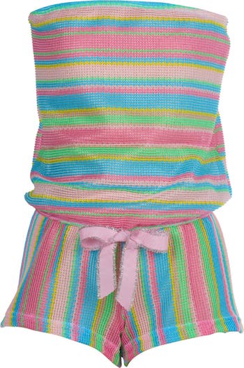 This striking strapless romper features a lightweight open-knit fabric adorned with a kaleidoscope of horizontal stripes on the bodice and elongating vertical stripes on the shorts. The ensemble is perfectly finished with a vibrant pink grosgrain ribbon at the waist, detailed with a shimmering silver edge for a high-fashion, boutique-ready finish.