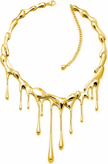 The Multi Drop Necklace in Gold Vermeil is Lucy Quartermaine's iconic statement piece. Crafted from 925 sterling silver with 3 microns of 18ct gold vermeil, it features cascading gold drops that create a molten effect. Adjustable from 16" to 20" and weighing 110 grams, it’s a bold, luxurious accessory. Featured on international catwalks and worn by celebrities, this necklace is perfect for making a striking statement.