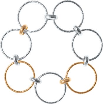 The Triple Hula Multi-Finish Bracelet is a contemporary masterpiece featuring interlocking rings with a mix of polished silver and gold vermeil finishes. Its modern design offers versatility, making it perfect for layering with other bracelets or wearing solo as a standout accessory. Inspired by playful hula hoops, this bracelet combines style and elegance effortlessly.