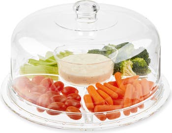 Serve up anything in style with this clear acrylic cake stand and serving platter. 4 separate pieces can be reconfigured to become a cake stand, chip and dip platter, large serving bowl, and serving platter with separate sections for different snacks.