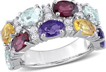 Showcase your vibrant individuality with the spectacular color palette and substantial size of this multi-gemstone ring. Crafted in luminous sterling silver, the piece features an impressive combination of aquamarine, rhodolite, citrine, iolite, and white topaz. With a total gemstone weight of five carats, the ring delivers a magnificent, cohesive burst of diverse hues and intense sparkle. This piece is a truly unique and luxurious statement of sophisticated style and individuality.