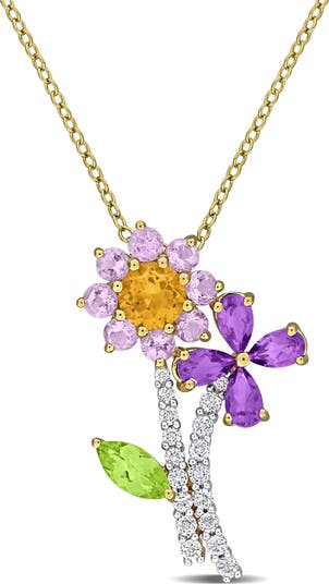 This stunning necklace features multi-colored gemstones, arranged in a beautiful flower design. Set in yellow flash-plated sterling silver, the bright gemstones create a vibrant and lively contrast, while the yellow sterling silver adds a warm and elegant touch. The 17-inch chain ensures a perfect fit, making it ideal for both everyday wear and special occasions. A charming and colorful addition to any jewelry collection.