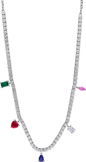 Add a splash of color to your look with this Lab-Created Multi-Gemstone Charm Station Necklace. Crafted in sterling silver, this 17-inch necklace features an array of vibrant lab-created gemstones, including emerald, ruby and blue, pink and white sapphires, each delicately set in a charming station design. The mix of shapes and colors creates a playful yet elegant accessory, perfect for adding a touch of whimsy and sophistication to any outfit.