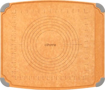 Made from natural wood fiber with easy-to-read pastry ring guides and every measurement make your baking experience accurate and precious. And the best part? Non slip feet ensure no sliding on the countertop and you just focus on rolling in the dough. There is even a resting nest for your rolling pin at the side of the board. Reversible design, just flip it over and you have an everyday cutting board, ready for all the chopping, dicing, and slicing. Throwing it into the dishwasher is our favorite thing. Non|slip feet ensure the cutting board remains steady with no sliding during food prep. Withstands temperatures up to 350°F, doubling as a trivet to shield your countertop from hot pots and pans.
