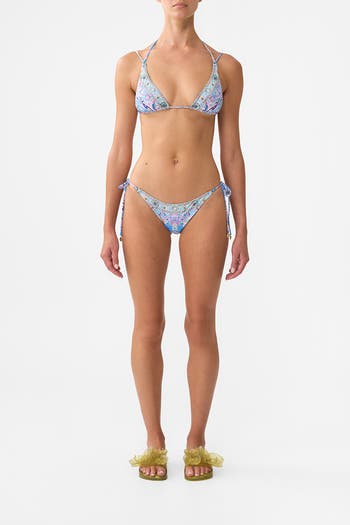 Inspired by the free roaming feeline guardians of Istanbul, the Footsteps In Folklore Multi Strap Tie Tri Bikini Set W Ring Trims is a handcrafted silhouette designed by our in house artisans. Reimagined in an exclusive limited edition print, this bikini set is made for B to C cups, with adjustable ties and removable soft cups for versatility. The bottoms have moderate coverage and is cut with a hipster waist and a regular leg rise. The bottoms feature side ties that are adorned with charms and the set is decorated with small silver rings and intracately placed crystals for luminous detail.