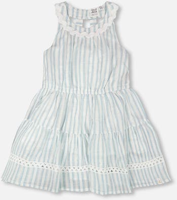 This multi-tiered dress with white and blue stripes is full of charming details. The sleeveless dress with a ruffled neckline continues to the back, where four charming vertical straps create a playful open design. The skirt flows in tiers and is enhanced with a delicate white lace-like row near the hem, adding texture and an elegant finish.