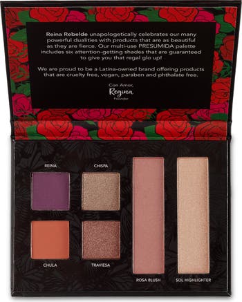 One palette with four attention-getting eyeshadow shades in a velvety formula that can be used wet and dry plus a warm blush and highlighter.