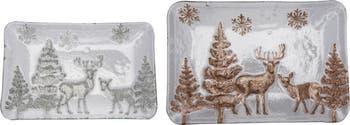 Enhance your holiday gatherings with the Transpac Glass 12.2 in Multicolor Christmas Winter Landscape Scene Platter Set of 2 These decorative trays are perfect for serving festive treats or displaying seasonal decor Each platter features a beautiful winter landscape scene in vibrant multicolor hues adding a touch of holiday cheer to your tabletop Crafted from high quality glass these platters are food safe and easy to clean simply spot or wipe clean after use With a height of 0.98 inches and a 12.2 inches length and width of 8.2 inches they are the ideal size for any occasion Celebrate the season with style and elegance using these charming platters perfect for Christmas gatherings and winter celebrations