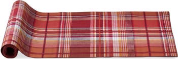 a red plaid cotton table runner is a classic and versatile piece that can be used to dress up any table setting. it is perfect for everyday use, as well as for special occasions. the red and white plaid pattern is both festive and timeless, and the cotton fabric is soft and durable. a stylish and functional addition to your tablescaping essentials this season! 100% cotton construction, this runner features hand screen printed textured weave. extremely versatile—relaxed enough for casual affairs, yet luxe and refined for more elegant soirees.