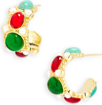 A colorful array of cabochons and faux pearls enrich these striking hoop earrings boasting a high-shine finish.