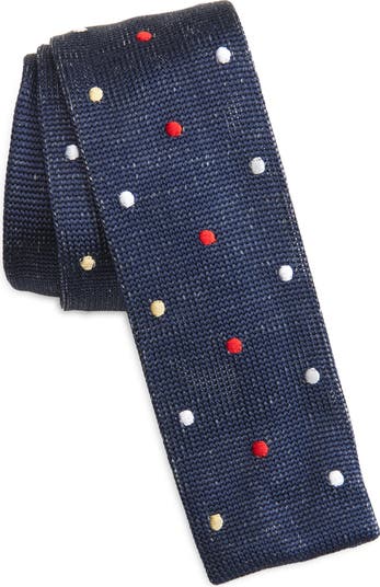 Small polka dots neatly pattern a tie that's crafted from knit silk and styled with a skinny, squared profile that's both retro and timeless.