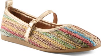 Multicolor herringbone raffia brings intricate texture to this contemporary leather ballet flat finished with metallic goldtone trim.