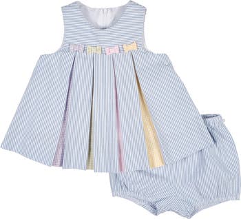 Classic and sweet, this two-piece dress is crafted from soft 100% cotton seersucker in medium blue and white stripes. Pleats and bows in multicolor check seersucker add a playful pop of color, creating a fresh, cheerful look perfect for warm days. The yoke dress silhouette features a pleated skirt that falls just above the knee, while the coordinating bloomer has an elastic waist and legs for comfort and easy movement. A back invisible zipper keeps dressing simple and polished.