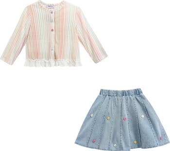 This playful set pairs soft pastel stripes with classic denim for a look that’s both sweet and stylish. The ruffled shirt features multicolor buttons and lace trim, while the pleated skort adds a pop of fun with scattered rainbow buttons—perfect for sunny outings or dress-up days.