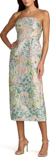 Elegant strapless brocade dress with vibrant multicolor detailing, a sleek silhouette, and hidden side pockets for polished special-occasion style.