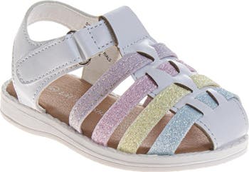 These versatile toddler girl's sandals are perfect for both indoor and outdoor play. Crafted with a durable faux leather upper, they offer comfort and style. The hook and loop closure makes them easy to put on and take off, while the rubber sole provides excellent traction. The multicolored straps add a playful touch to these practical sandals.