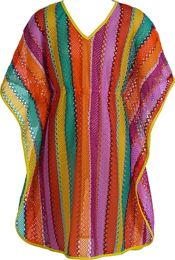 This striking kaftan features vibrant vertical stripes in a tropical palette of orange, red, turquoise, and purple. Crafted from a lightweight open-knit mesh, the silhouette is defined by a flattering V-neckline with sunshine-yellow trim and an elasticated cinched waist that creates a playful, airy drape.
