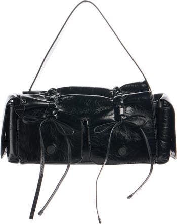 Texture and sheen collude to grab all the attention for this Italian-made baguette bag crafted from crinkled calfskin leather. The multipocketed construction is detailed with knotted lacing and jean-inspired embossed buttons for added gleam. A logo-engraved heart adds a playful signature to the look.