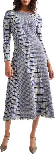 Fall for the look and feel of this tactile tweed midi punctuated with a perfect-for-twirling flared skirt.