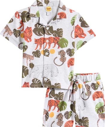Your little explorer will look fresh and feel comfortable in this breezy stretch-cotton set of a camp shirt and matching shorts that give them a resort-ready vibe.