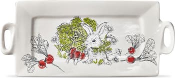 it's all in the details. spring and summer get-togethers call for bright colors and eye-catching designs. serve up your appetizers and hors d'oeuvres alongside fun garden bunnies with our munching bunny rectangle platter. made from earthenware, this platter features an organically shaped body with a decal design.