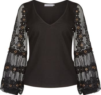 The Munira is a pullover top from Anne Fontaine, expertly crafted from soft pima jersey cotton for a smooth, sculpted fit. Framed by a deep V-neckline, this refined silhouette is elevated by sheer mesh sleeves, richly adorned with tonal floral lace appliqués. Each flower is intricately embroidered and accented with metallic grommet centers, creating a striking interplay of texture and light. The sleeves, voluminous yet airy, taper into pima jersey cuffs that form a soft balloon shape—adding fluidity and balance to the sleek body. Elegant and expressive, the Munira top reimagines everyday dressing with Anne Fontaine’s signature blend of femininity, structure, and modern detail.