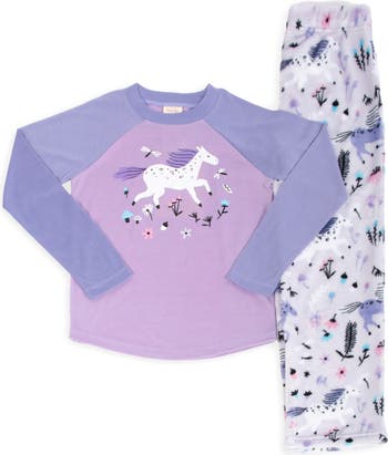 Treat your little darling to cozy slumber with this pajama set featuring a raglan top and soft fleece pants patterned with prancing ponies in a forest scene.