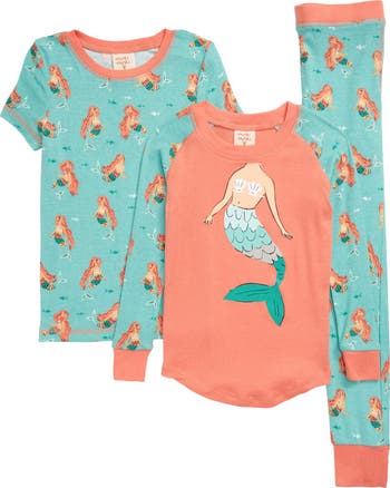 Mix and match these lightweight, stretch-knit PJs featuring a short-sleeve top, long-sleeve top and leggings all splashed with whimsical mermaids.