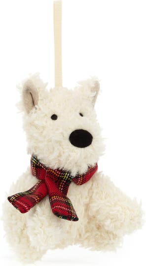 Snuggly fur and a cozy scarf bring wintry cheer to a soft dog that will add a friendly face to your tree this season.