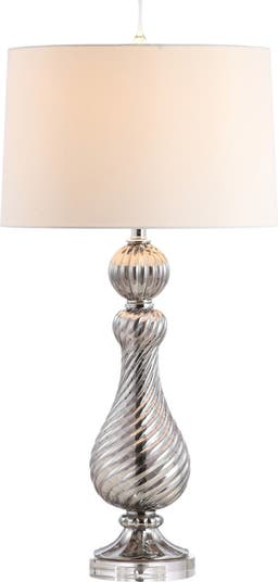 Inspired by Murano glass, our gray glass lamp adds low-key glamour to your bedroom or living room; or use two on a dining room console. The silvery glass base is topped by a silk drum shade for mid-century modern flair. Finished with upscale touches like the crystal finial and silk-wrapped cord. Includes a dimmable LED bulb.