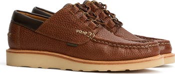 Rawhide laces and a covered moc toe bring classic boat-shoe detailing to an everyday lace-up that pairs an upper of durable pebbled leather with a cushioned leather footbed. It sits on a contrast rubber sole molded with chevron lugs that put confident grounding under every step.