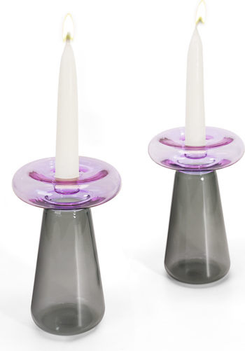 These mouth-blown borosilicate glass candlesticks feature a soft mushroom-shaped form and two-tone color combinations. Designed to pair with Buttercup Glasses, they add color and light to the Shabbat table while remaining simple enough for everyday use. Durable glass construction makes them suitable for weekly ritual use and long-term enjoyment.