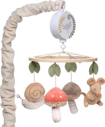 Two colorful mushrooms, one cute little mouse, and one sweet snail circle slowly underneath green leaves and a wooden ring. The mushrooms are made of a soft velour and textured boucle with embroidered dots and are 4 inches tall. The little mouse is a tan color velour with an embroidered face and is 4 inches tall. The whimsical little snail is a tan velour with an embroidered swirl pattern and is 3 ½ inches tall. This musical mobile plays nursery songs for 20 minutes, has an on/off switch, and volume control. It plays Brahms Lullaby, Twinkle, Twinkle Little Star, and Rock-a-Bye-Baby. Requires 3 AAA batteries, not included.