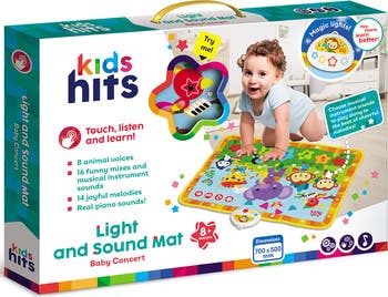 KIDS HITS: LIGHT & SOUND MAT: BABY CONCERT - Interactive play mats have gained popularity for being versatile and practical, attractive and educational at the same time. Light and Sound Mat Baby Concert allows children to explore simple music concepts through creative play. MUSICAL FUN: Kids can enjoy a great variety of musical instrument sounds, sing along to popular songs and play along to the beat of music! Choose musical instrument sounds to play along to the beat of cheerful melodies! This is a fun way to acquire first knowledge about animals and learn colors. FLASHING LIGHTS: Bright lights create a festive atmosphere and invite everyone to play! Let your little one shine like a star in their very first Baby Concert! The Kids Hits Light and Sound Mat transforms playtime into a full-blown musical adventure. EXCITING MODES: Sound Mode - Press the pictures and listen to animal voices. Song Mode - Press the piano keys and listen to cheerful songs. Musical Instrument Mode - Listen to amusing melodies played on different musical instruments. The mat also includes volume control. With real piano notes, animal voices, and flashing lights, your baby will crawl, tap, and groove their way into early learning. Whether they’re discovering joyful melodies or getting curious about the funny animal sounds, this mat is a total sensory playground. Perfect for tummy time, crawling, or just kicking to the beat — Baby Concert mat isn’t just a toy, it’s a stage. DIMENSIONS: 27.6 in x 19.7 in (70 cm x 50 cm). Play more, learn better!