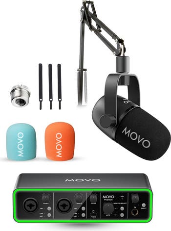 Movo Music Audio Interface Bundle - Phantom USB Audio Interface, CastMic XLR Dynamic Microphone, and Boom Arm - Professional Studio Equipment for Musicians, Singers, and Producers The Movo Music Audio Interface Bundle is the ultimate solution for musicians, singers, and producers seeking professional studio equipment. This comprehensive bundle includes the Phantom USB Audio Interface, the CastMic XLR Dynamic Microphone, and the ASM5 Boom Arm, offering all the tools needed to capture pristine audio for vocals, instruments, and live performances. Whether you™re setting up a home studio or performing live, this bundle is designed to deliver studio-grade sound quality and flexibility. Key Features: Professional Audio Interface for Musicians: The Movo Phantom USB Audio Interface features dual channels, high-quality preamps with a 110dB dynamic range, and 48V phantom power to support high-end condenser and dynamic microphones. It ensures crystal-clear sound capture, perfect for recording vocals, instruments, or live performances with precision and depth. Dynamic Microphone for Studio Recording: The CastMic XLR Dynamic Microphone delivers rich, clear audio with its cardioid polar pattern and 40Hz-16kHz frequency response. Designed to minimize background noise, it™s perfect for vocalists, instrumentalists, and producers who want to achieve professional-level recordings in any studio setting. Seamless Connectivity and Flexibility: The Phantom USB Audio Interface comes with dual monitor outputs and a USB-C smartphone input, offering versatility for both studio and mobile recording setups. The CastMic connects via XLR to professional mixers and interfaces, ensuring superior sound quality and easy integration with your recording equipment. Built for Studio and Stage: Designed to meet the demands of musicians, the Phantom Interface features a rugged build and 22 adjustable light modes for a sleek and stylish studio experience. The CastMic™s durable metal construction ensures it withstands daily use, whether in the studio or during live performances. Complete Music Production Setup: The included ASM5 Boom Arm allows for hands-free recording with precise microphone positioning, making it easier to capture every nuance of your performance. This bundle provides everything you need to create high-quality music content, whether you™re working from home or in a professional studio. Designed in Los Angeles: Movo is proud to support the music creation community, offering innovative, musician-focused gear designed to enhance your creative process. Elevate your music production with the Movo Music Audio Interface Bundle, delivering all the tools you need for a professional recording experience.