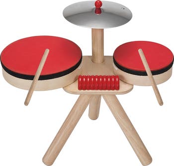 Your budding rockstar is ready to take center stage with this kid-sized musical set featuring different-sized drums, a cymbal and a guiro.
