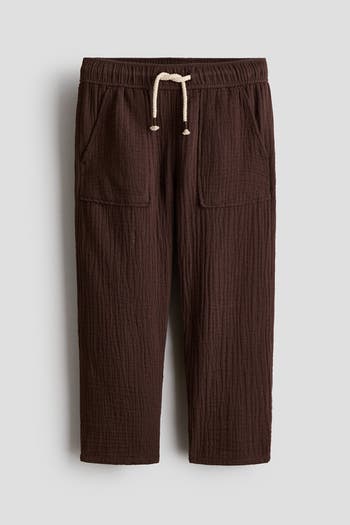 Relaxed-fit trousers in soft cotton muslin featuring an elasticated, drawstring waist, patch front and back pockets and straight legs.