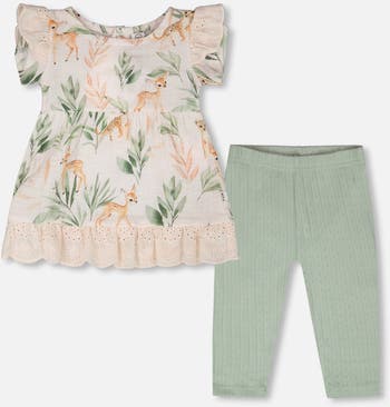 The muslin tunic and pointelle leggings set peach with deer print and green brings a breath of springtime charm. A delicate tunic with short sleeves with ruffles, a gathered waist, and a frilled hem pairs with textured pointelle leggings in soft green. The tunic is made from lightweight muslin enriched with elastane for comfort, while the leggings are crafted from pure cotton for breathability. Perfect for playful outings or sunny strolls, this set captures a poetic blend of style and comfort. Ideal for pairing with other pieces from our "Savannah Whispers" collection for a harmonious seasonal look.