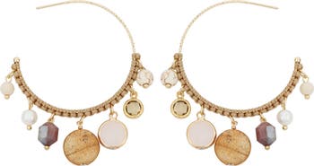 An assorted mix of crystals hang from thread-wrapped hoop earrings destined to make a statement wherever you go.