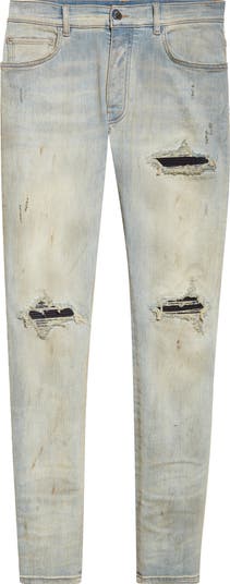 Pleated suede backs the handmade rips on this new iteration of the MX1 skinny jeans cut from stretch denim in a faded wash that's undergone a special process that results in variations of shading and color.