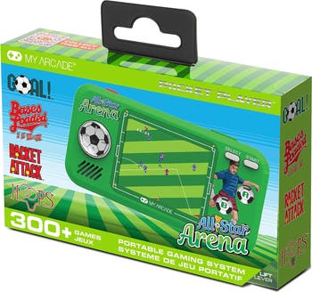 MY ARCADE All-Star Arena Pocket Player Includes fully playable versions of GOAL!™, BASES LOADED™ 1,2,3 and 4, RACKET ATTACK™ and HOOPS™. The All-Star Arena Pocket Player features a full color 2.75Inch screen to brightly display all 7 titles and is fine-tuned for hours of play through its emphasis on ergonomics and compact design. Features 7 officially licensed Jaleco titles + 300 retro style bonus games Full color 2.75Inch screen Built-in front facing speaker, volume control and 3.5 mm headphone port Powered by either 4 AAA batteries (not included) or by any Micro-USB cable (not included) Compact size and included lanyard make for perfect on the go gaming Jaleco game titles include GOAL!™, BASES LOADED™ 1,2,3 and 4, RACKET ATTACK™ and HOOPS™. Includes Pocket Player®, Lanyard, User guide Pocket Player Dimensions 5.38InchW x 2.75InchH x 0.88InchD PACKAGE LANGUAGES English, French and Spanish | USER GUIDE LANGUAGES English, French, Spanish, Portuguese, Italian, German, Dutch, Japanese and Arabic