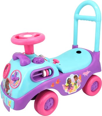 MY FIRST LIGHTS N' SOUNDS: ACTIVITY RIDE-ON - ARIEL - Dive into an enchanting undersea adventure with Ariel and this beautifully designed ride-on toy, featuring vibrant shades of blue, pink, and purple adorned with whimsical mermaid graphics! This magical ride-on is packed with interactive features that spark your little one’s imagination while providing hours of fun and active play. The activity-filled dashboard offers endless entertainment, including a charming little clock for imaginative role-play, a peek-a-boo window to engage curious minds, and a removable play phone that encourages creative storytelling and pretend play. Your child can lift the seat cover to discover a handy storage compartment, perfect for keeping small treasures and toys safe during their aquatic adventures. The sturdy seat-back handle doubles as a push-along support, allowing toddlers to build their confidence and stay active while enjoying their journey under the sea. Designed with safety and durability in mind, this ride-on ensures hours of secure playtime for your little adventurer, whether they’re exploring indoors or outdoors. The lively sounds and flashing lights bring the magical world of Ariel to life, making every ride an unforgettable experience. Powered by 2 AA batteries (included), this ride-on is ready to deliver excitement straight out of the box. Beyond the fun, this activity-packed ride-on supports early childhood development by helping improve gross motor skills, enhancing balance and coordination, and fostering independent play. Ideal for toddlers ages 12 months and up, it’s the perfect way to encourage growth, exploration, and creativity while embarking on magical adventures with Ariel.
