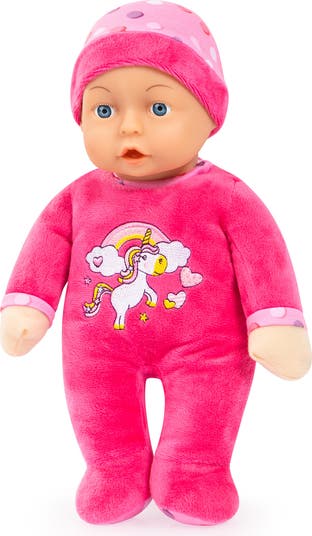 BAYER DESIGN DOLLS: MY FIRST: BABY - 12" PINK, UNICORN - Introducing the perfect companion for cuddles and hugs: our adorable pink baby doll embroidered with a charming unicorn motif! With a size of 12 inches (30 cm), this sweet doll is just the right size for little arms to wrap around and snuggle. Featuring a soft body with sewn feet and hands, this baby doll is as huggable as can be. Dressed in a cute and colorful pink-on-pink outfit adorned with a delightful unicorn motif, she's ready to captivate hearts wherever she goes. And to top it off, we've included a matching pink-on-pink cap for added charm. Thanks to her handy size, this baby doll is perfect for on-the-go adventures. Whether visiting friends, grandparents, kindergarten, or embarking on an excursion, she's always ready to accompany your child on their next adventure. With her soft body and portable size, this baby doll is not only ideal for cuddling but also encourages imaginative play and role-playing fun.