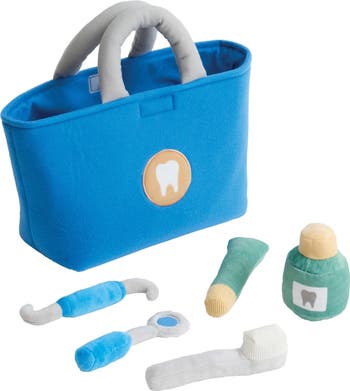 18 months & up. Encourage healthy habits, awareness of oral hygiene, and dental role play with this plush dentist kit. Store the machine washable, fabric pieces in the convenient carrying bag for easy organization and movement around the classroom. Set includes plush toothbrush, dental mirror, toothpaste tube, floss, mouth wash, and carrying bag.
