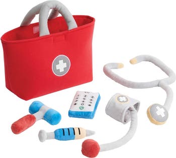 18 months & up. Encourage healthy habits, doctor-themed role play, and conversations about health and doctor's visits with a plush doctor kit. Store the machine washable, fabric pieces in the convenient carrying bag for easy organization and movement around the classroom. Set includes reflex hammer, stethoscope, syringe, blood pressure monitor, mobile phone, and carrying bag.