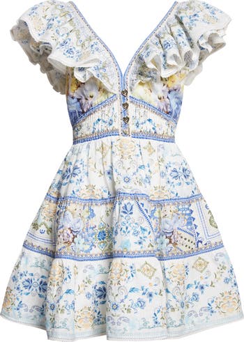 The limited edition My Homespun Heart print—inspired by grandeur of Ottoman palaces that feature Baroque and Rococo flourishes—illustrates this both charming and alluring minidress styled with a crystal=traced plunging neckline, a smocked Empire waist and a bow-tied open back.