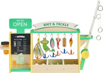 Reel in imaginative fun with this tabletop fish-and-tackle shop featuring a working cash register stocked with play money.