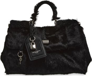 Signature understated elegance and modern aesthetics merge on this structured handbag crafted in Italy from tactile calf hair. A rolled handle and removable shoulder strap allow for carrying versatility, while logo-engraved hardware authenticates the pristine style.