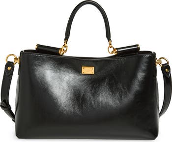 Signature understated elegance and modern aesthetics merge on this structured handbag crafted in Italy from glossy leather. A rolled handle and removable shoulder strap allow for carrying versatility, while logo-engraved hardware authenticates the pristine style.
