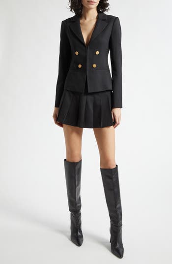 Sharp skirt pleats bring swingy movement to this tailored blazer-dress finished with a faux double-breasted front.